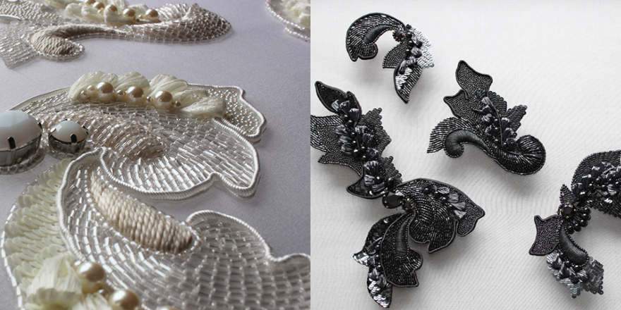 メゾン・デ・ペルル刺繍教室では様々な材料を使って本格的なオートクチュール刺繍の技術を学ぶ事ができます。